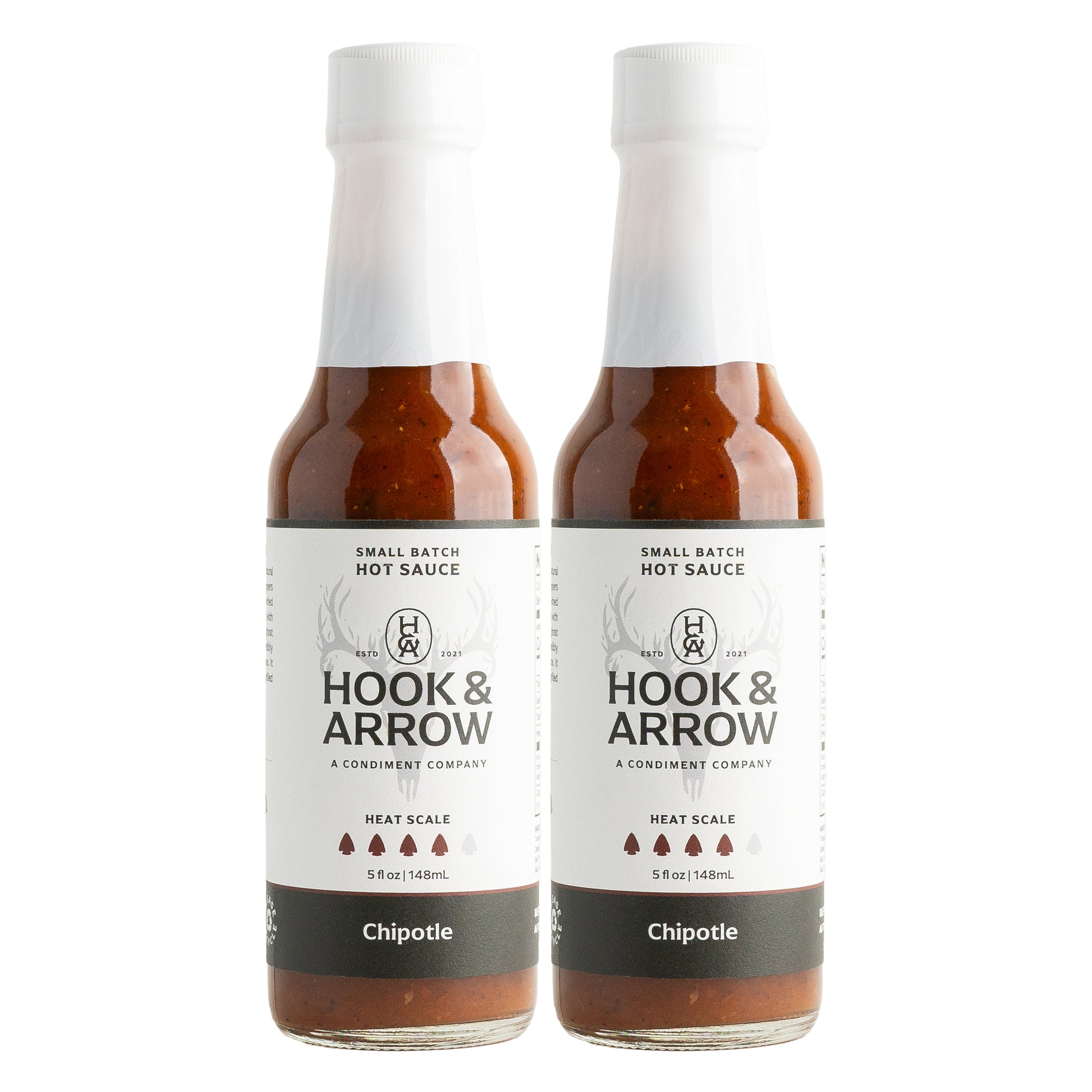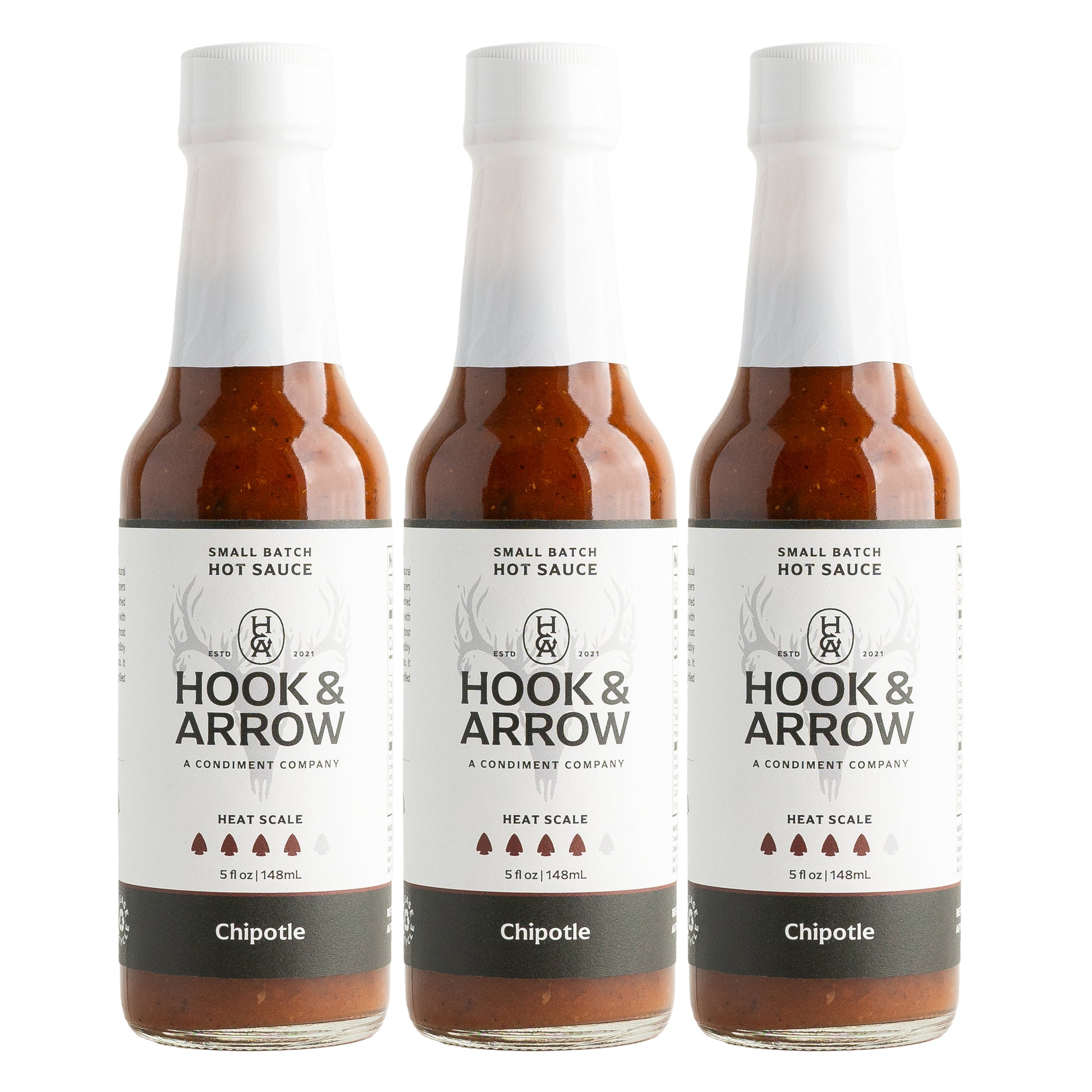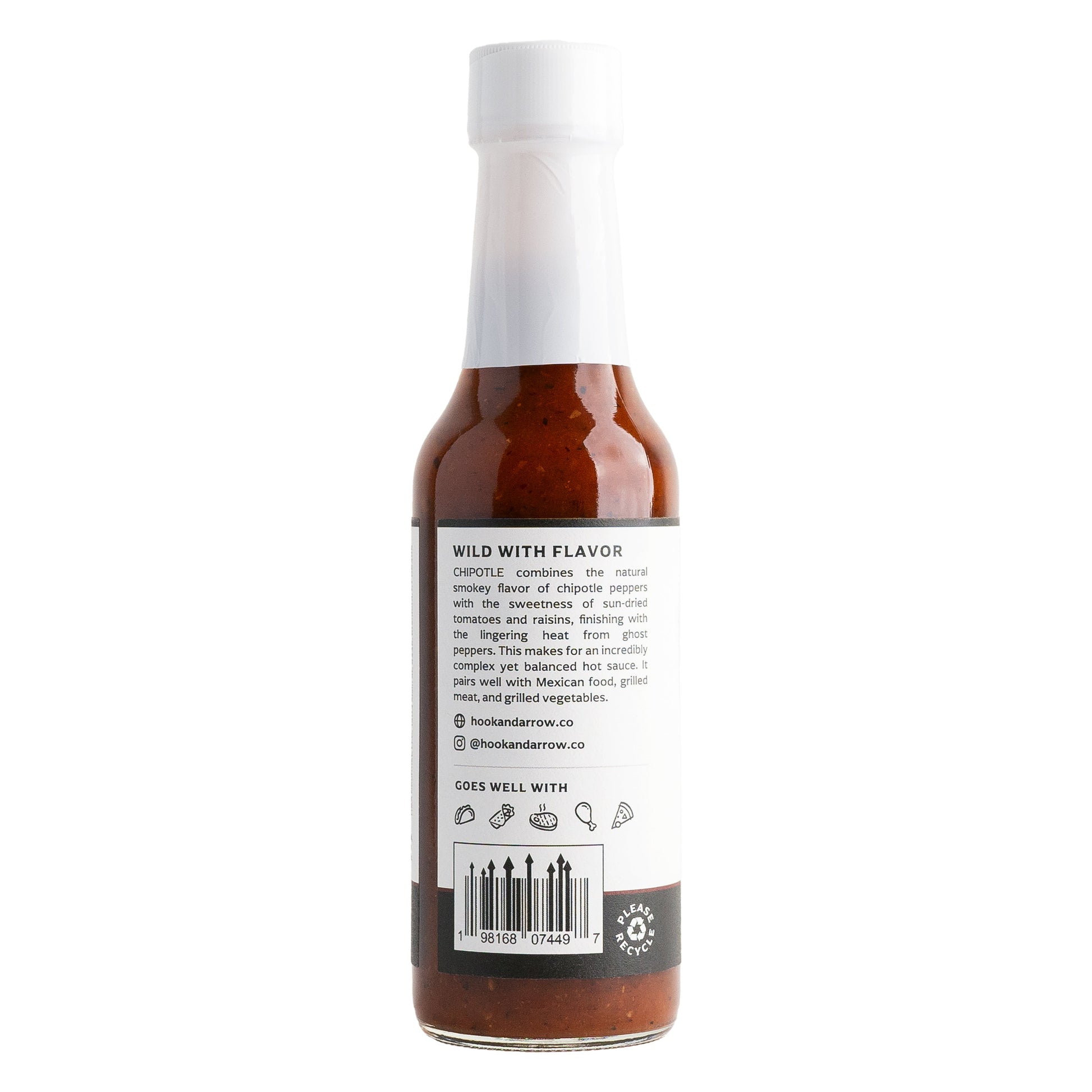 Hook & Arrow's CHIPOTLE hot sauce combines the natural smokey flavor of chipotle peppers with the sweetness of sun-dried tomatoes and raisins, finishing with the building heat from ghost peppers. This makes for an incredibly complex yet balanced hot sauce. It pairs well with Mexican food, grilled meat, and grilled vegetables.