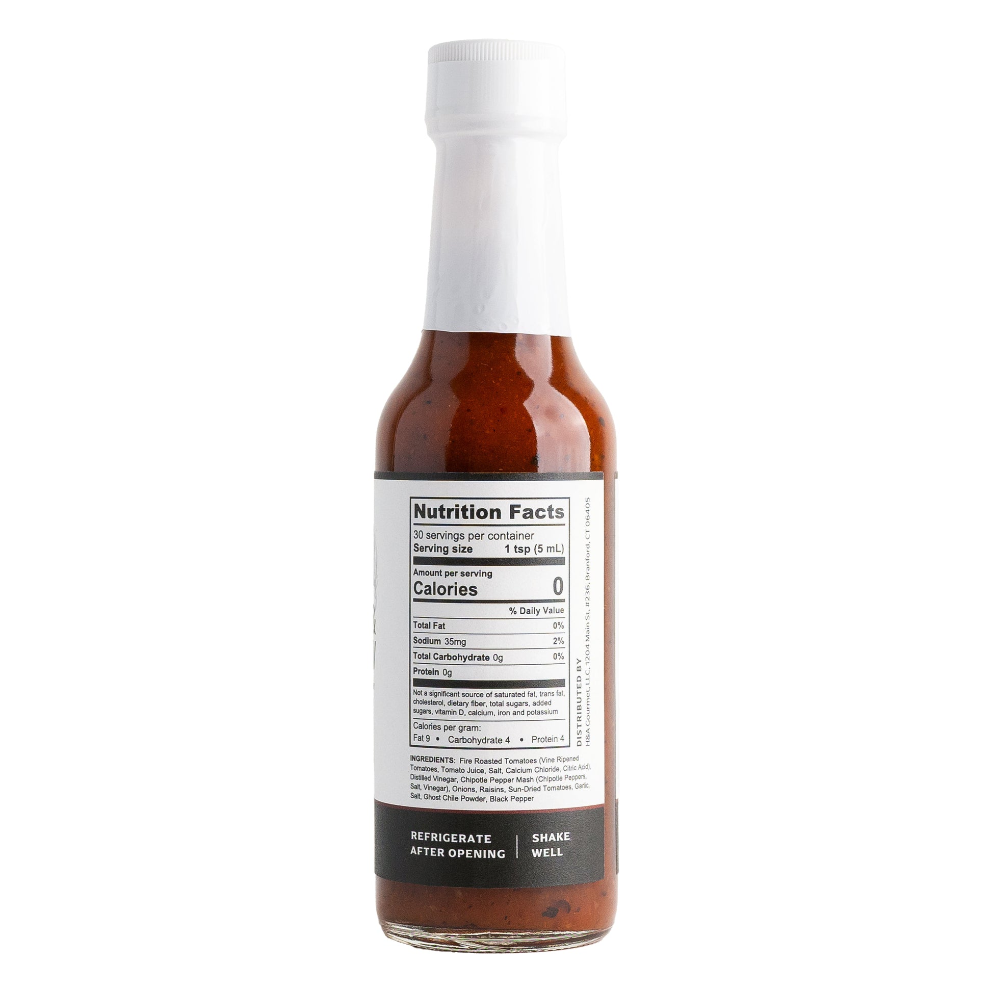 Ingredients: Fire Roasted Tomatoes (Vine Ripened Tomatoes, Tomato Juice, Salt, Calcium Chloride, Citric Acid), Distilled Vinegar, Chipotle Pepper Mash (Chipotle Peppers, Salt, Vinegar), Onions, Raisins, Sun-Dried Tomatoes, Garlic, Salt, Ghost Chile Powder, Black Pepper