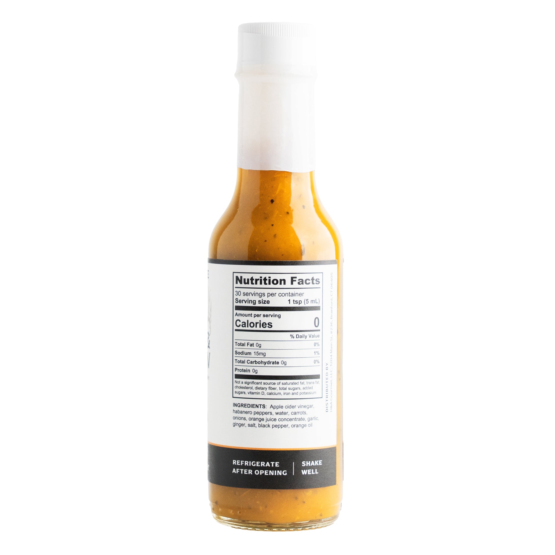 Ingredients: Apple cider vinegar, habanero peppers, water, carrots, onions, orange juice concentrate, garlic, ginger, salt, black pepper, orange oil