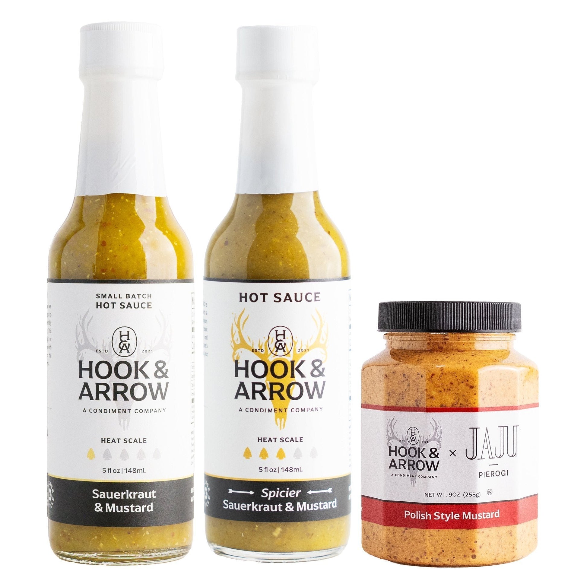 Includes Sauerkraut & Mustard Hot Sauce, Spicier Sauerkraut & Mustard Hot Sauce and Polish Style Mustard.